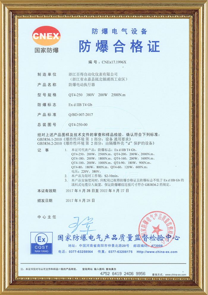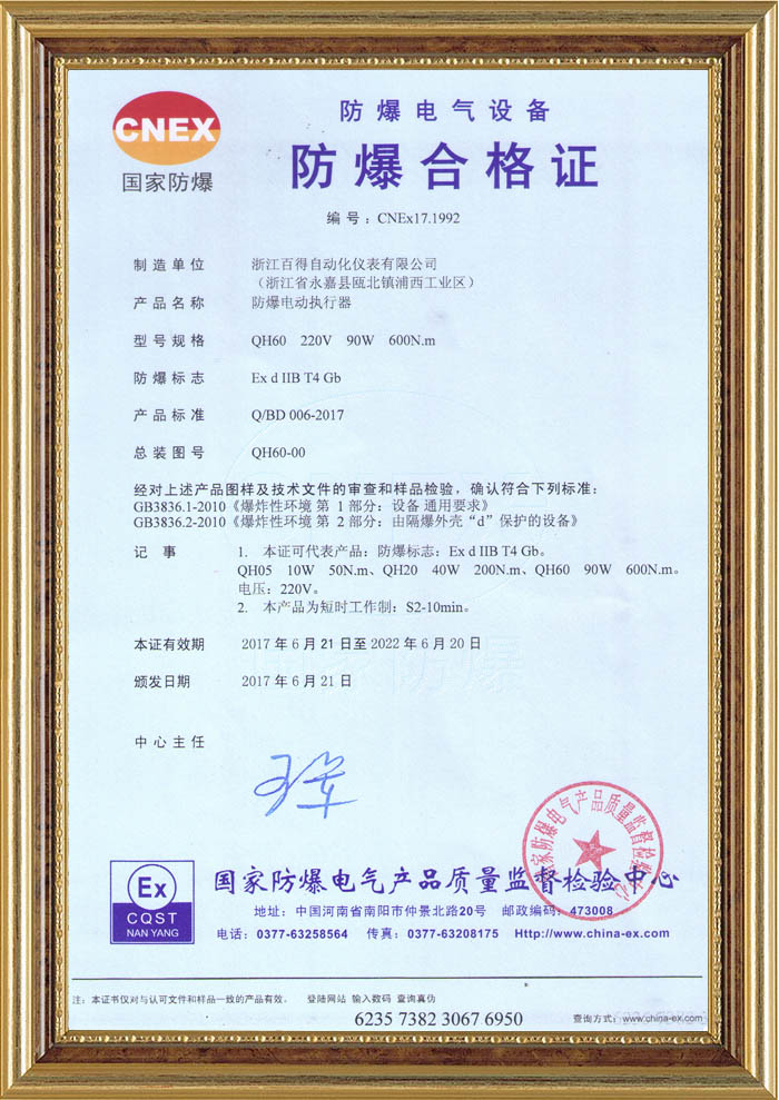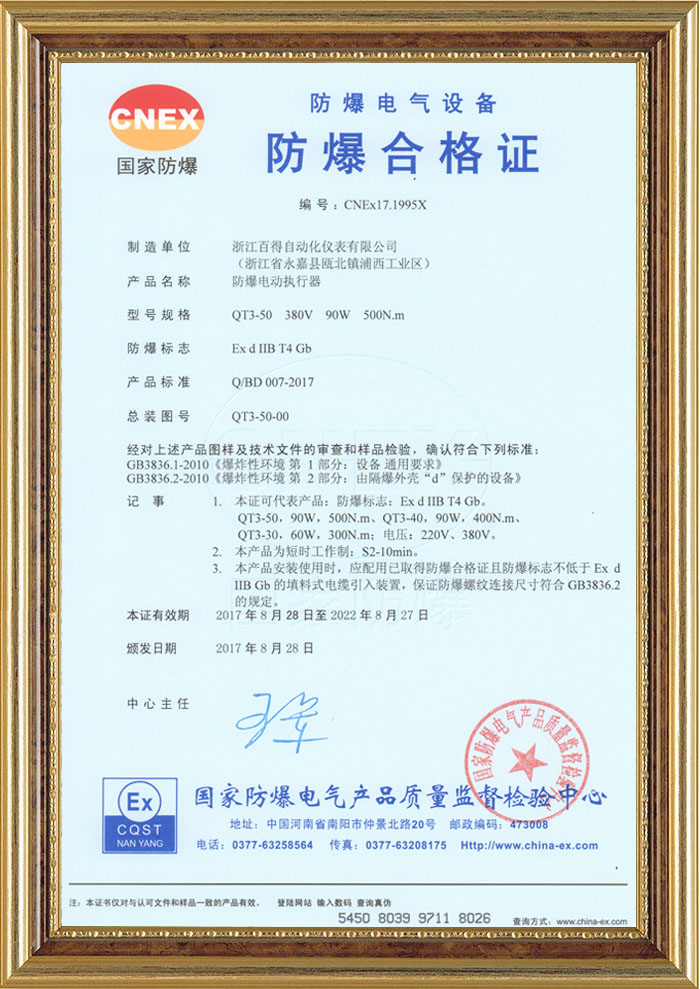 電動球閥包含電動執行裝置驅動的多類型球閥產品,包括了各種形式密封面的多種規格的球閥產品。浙江百得自動化生產的電動球閥具備國家防爆合格證書,防爆性能更可靠。ISO9001認證產品,質量有保障!